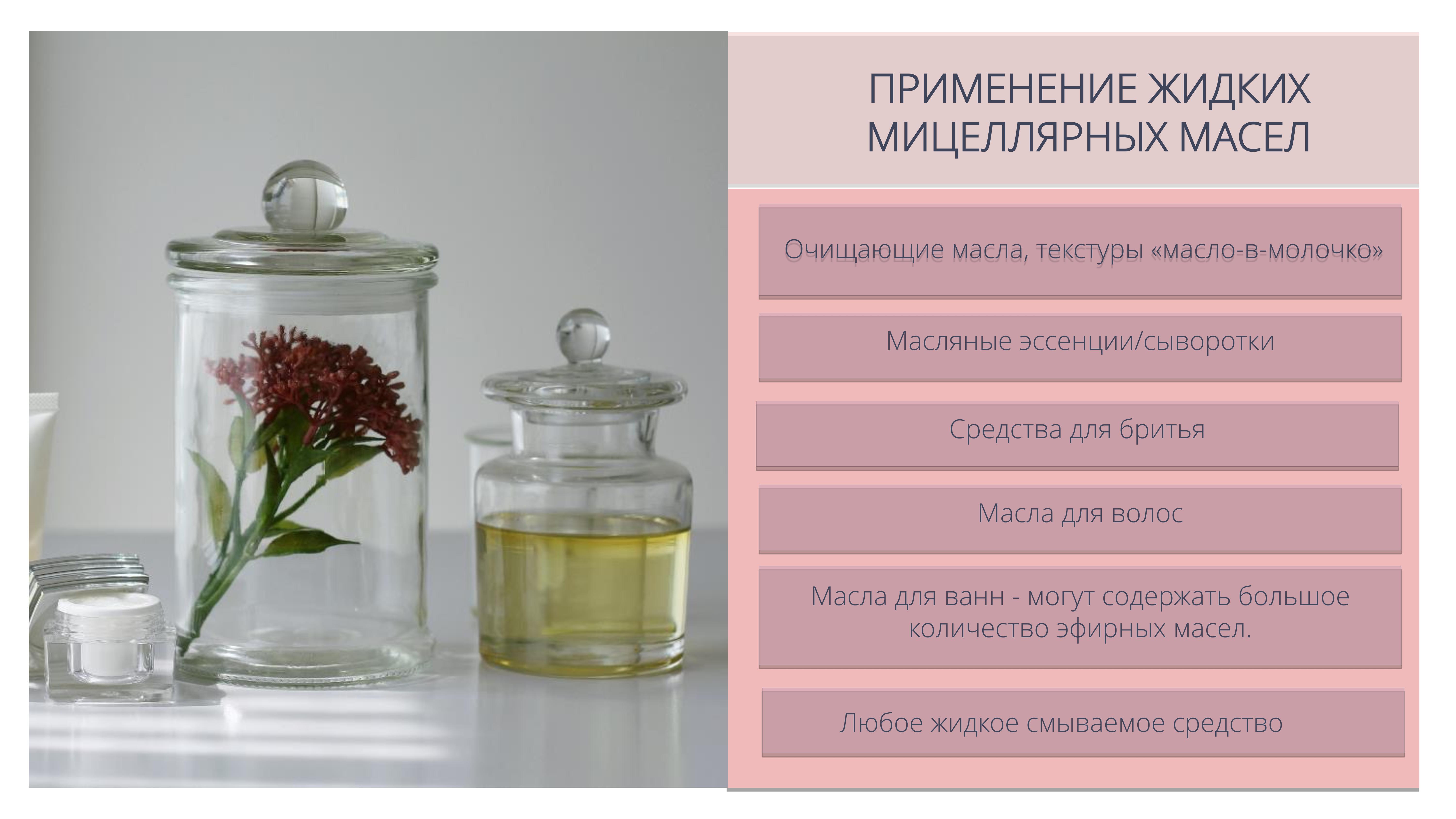 Позволяет создавать ультра актуальные прозрачные мицеллярные масла для очищения кожи и снятия макияжа, продукты для купания («молочные ванны»), гидрофильные масла для душа.